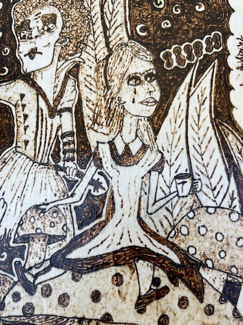 "Alice Trippin' Ball" Wood Pyrography Shield