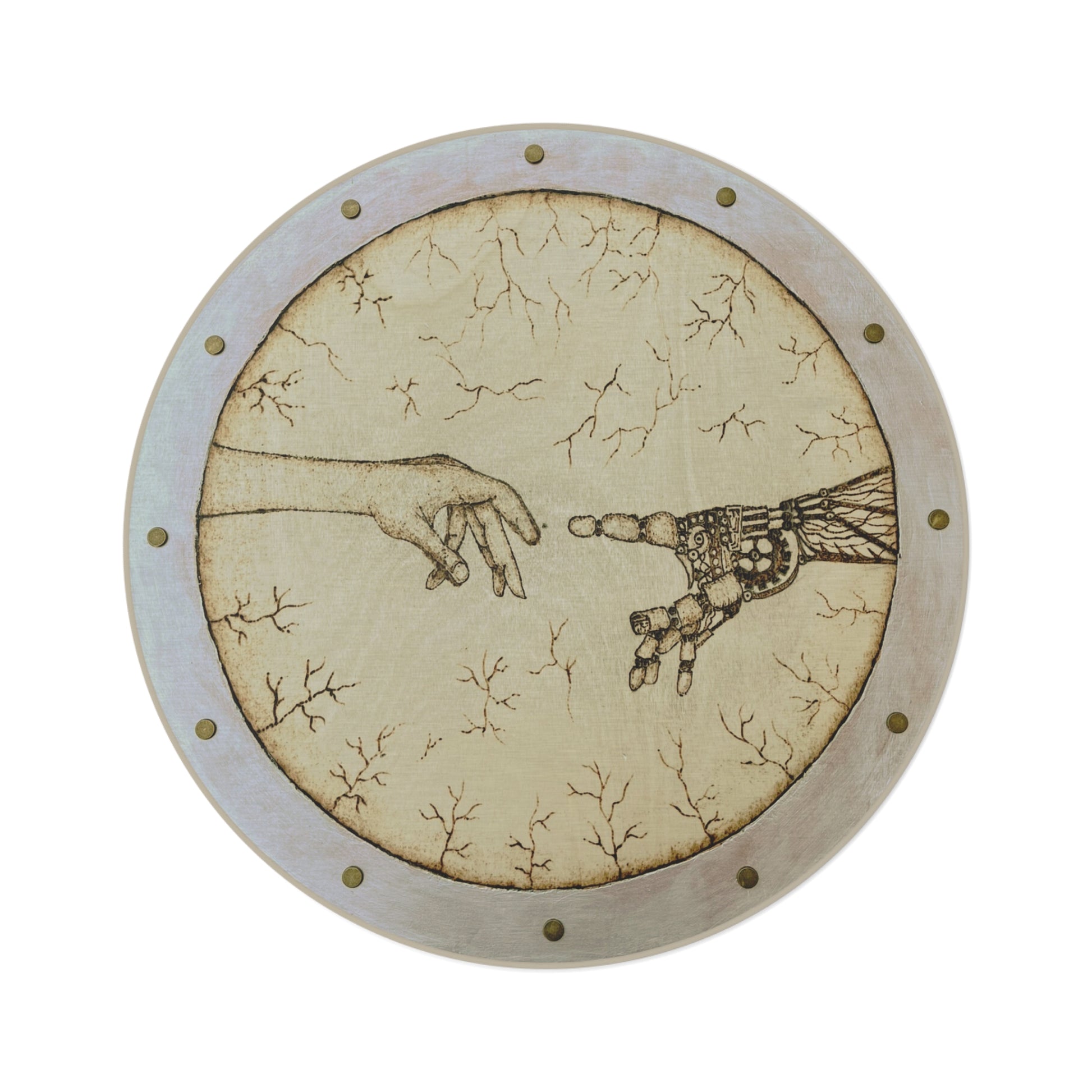 "Adam Meets Robot." Artist Lane Anders screenprint from high resolution scan of original pyrography on wood. Highlight colors: tan, brown, beige, ivory. Artist Lane Anders is permanently disabled from a traumatic brain injury (TBI), is visually impaired, and is a retired and talented professional musician.
