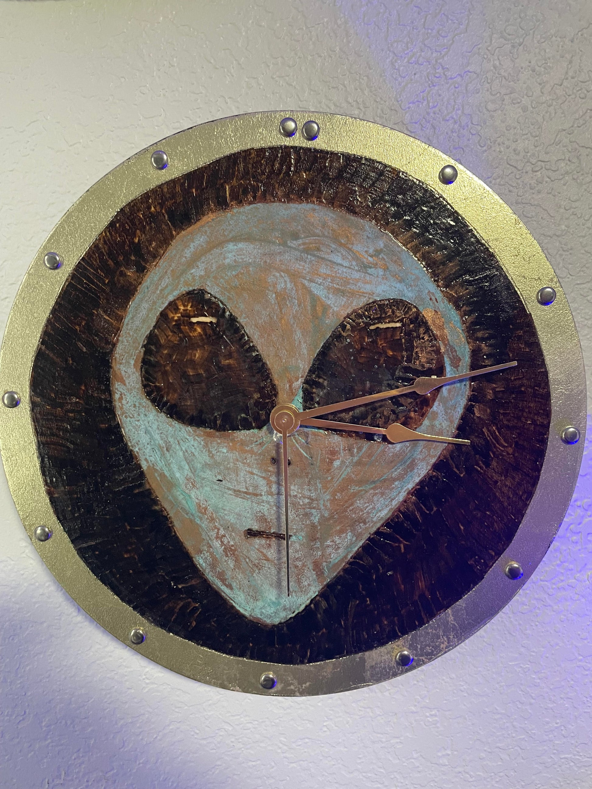 12” wood pyrography clock. Gold leaf patina with copper alien. Stainless steel rivets, dual 1/2s blacked out in back for hidden 3D effect. Rubber bumpers, sawtooth hanger. Traumatic brain injured (TBI) and visually impaired artist Lane Anders was inspired to paint an alien head and make it into a clock, so he did.